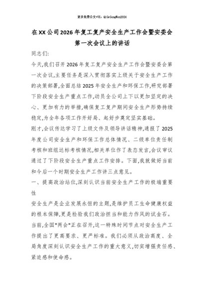 【七哥公文】2026年:在XX公司2026年复工复产安全生产工作会暨安委会第一次会议上的讲话_副本+更多免费公文+VX:QiGeGongWen2024