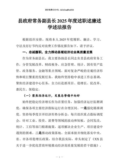 【七哥公文】2026年:县政府常务副县长2025年度述职述廉述学述法报告+更多免费公文+VX:QiGeGongWen2024