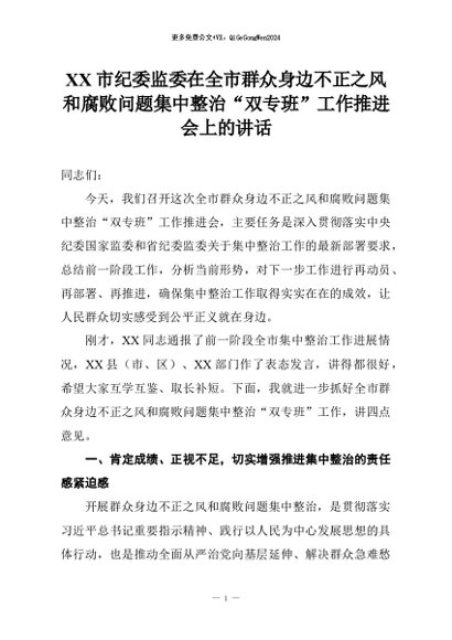 【七哥公文】2026年:XX市纪委监委在全市群众身边不正之风和腐败问题集中整治“双专班”工作推进会上的讲话+更多免费公文+VX:QiGeGongWen2024