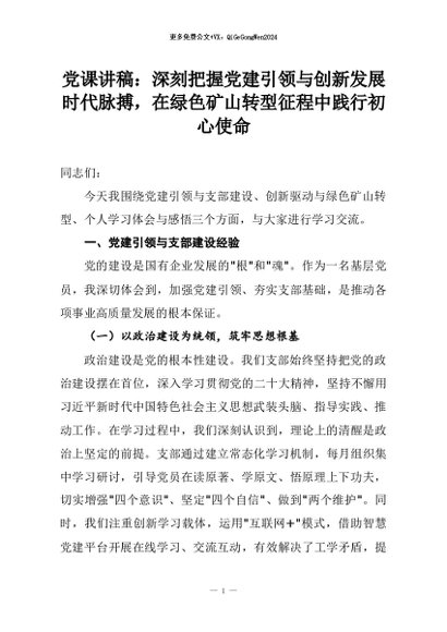【七哥公文】2026年:党课讲稿:深刻把握党建引领与创新发展时代脉搏,在绿色矿山转型征程中践行初心使命+更多免费公文+VX:QiGeGongWen2024