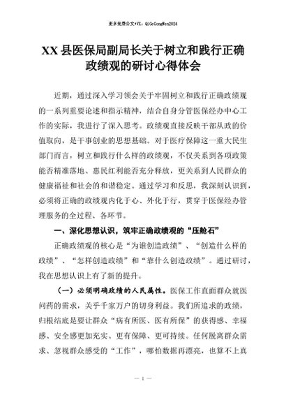 【七哥公文】2026年:XX县医保局副局长关于树立和践行正确政绩观的研讨心得体会+更多免费公文+VX:QiGeGongWen2024