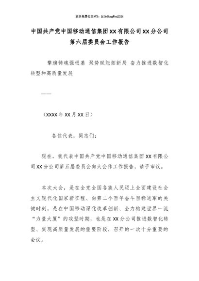 【七哥公文】2026年:中国共产党中国移动通信集团XX有限公司XX分公司第六届委员会工作报告_副本+更多免费公文+VX:QiGeGongWen2024