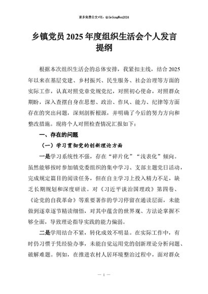/ 【七哥公文】2026年:乡镇党员2025年度组织生活会个人发言提纲+更多免费公文+VX:QiGeGongWen2024