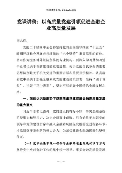 【七哥公文】2026年:党课讲稿:以高质量党建引领促进金融企业高质量发展+更多免费公文+VX:QiGeGongWen2024