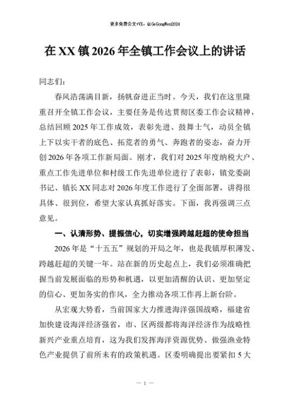 / 【七哥公文】2026年:在XX镇2026年全镇工作会议上的讲话+更多免费公文+VX:QiGeGongWen2024