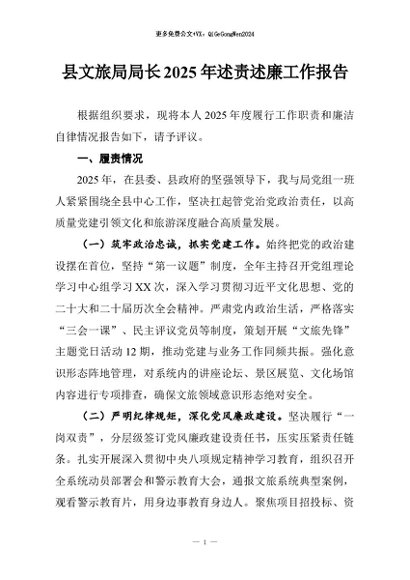 【七哥公文】2026年:县文旅局局长2025年述责述廉工作报告+更多免费公文+VX:QiGeGongWen2024