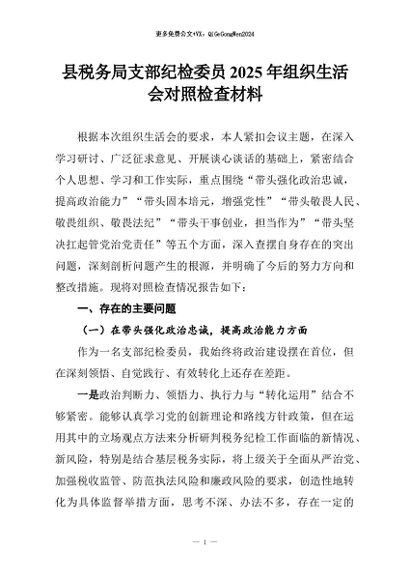 【七哥公文】2026年:县税务局支部纪检委员2025年组织生活会对照检查材料+更多免费公文+VX:QiGeGongWen2024