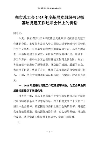 【七哥公文】2026年:在市总工会2025年度基层党组织书记抓基层党建工作述职会议上的讲话+更多免费公文+VX:QiGeGongWen2024