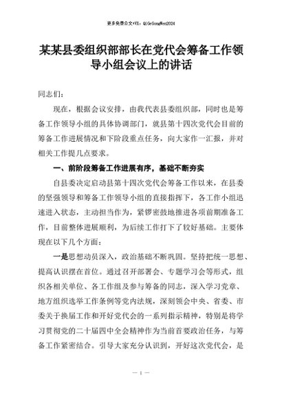 【七哥公文】2026年:某某县委组织部部长在党代会筹备工作领导小组会议上的讲话+更多免费公文+VX:QiGeGongWen2024