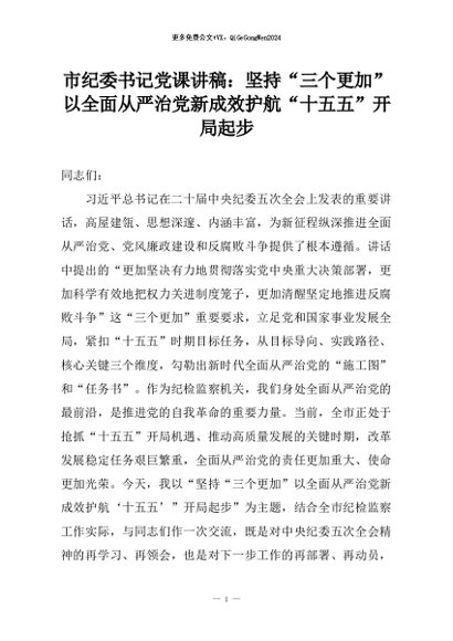 【七哥公文】2026年:市纪委书记党课讲稿:坚持“三个更加”以全面从严治党新成效护航“十五五”开局起步+更多免费公文+VX:QiGeGongWen2024