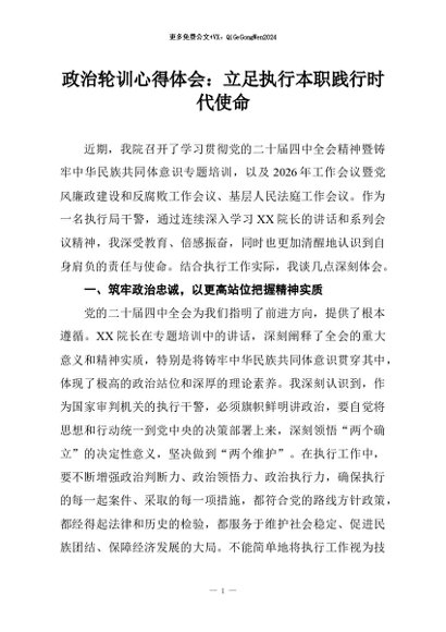 / 【七哥公文】2026年:政治轮训心得体会:立足执行本职践行时代使命+更多免费公文+VX:QiGeGongWen2024