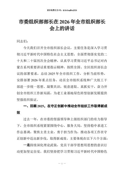 【七哥公文】2026年:市委组织部部长在2026年全市组织部长会上的讲话+更多免费公文+VX:QiGeGongWen2024