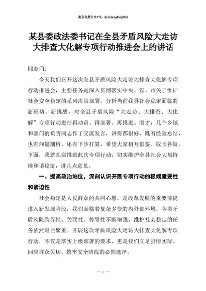 【七哥公文】2026年:某县委政法委书记在全县矛盾风险大走访大排查大化解专项行动推进会上的讲话+更多免费公文+VX:QiGeGongWen2024