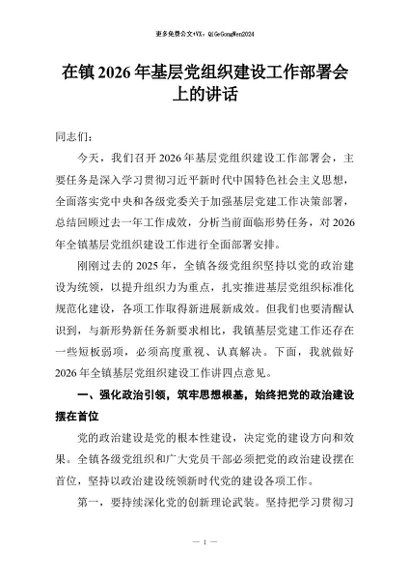 / 【七哥公文】2026年:在镇2026年基层党组织建设工作部署会上的讲话+更多免费公文+VX:QiGeGongWen2024