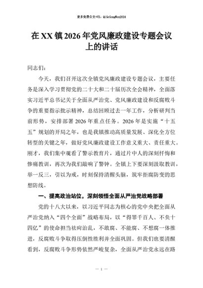 【七哥公文】2026年:在XX镇2026年党风廉政建设专题会议上的讲话+更多免费公文+VX:QiGeGongWen2024
