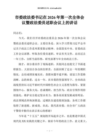 【七哥公文】2026年:市委政法委书记在2026年第一次全体会议暨政法委员述职会议上的讲话+更多免费公文+VX:QiGeGongWen2024