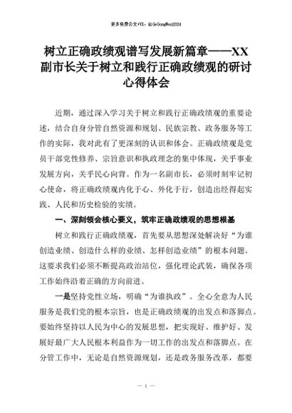 【七哥公文】2026年:树立正确政绩观谱写发展新篇章——XX副市长关于树立和践行正确政绩观的研讨心得体会+更多免费公文+VX:QiGeGongWen2024