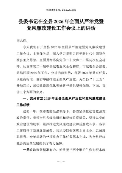 【七哥公文】2026年:县委书记在全县2026年全面从严治党暨党风廉政建设工作会议上的讲话+更多免费公文+VX:QiGeGongWen2024