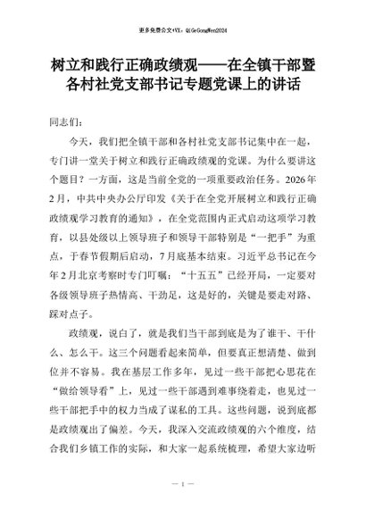 【七哥公文】2026年:树立和践行正确政绩观——在全镇干部暨各村社党支部书记专题党课上的讲话+更多免费公文+VX:QiGeGongWen2024