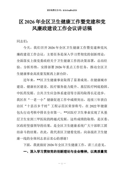 【七哥公文】2026年:区2026年全区卫生健康工作暨党建和党风廉政建设工作会议讲话稿+更多免费公文+VX:QiGeGongWen2024