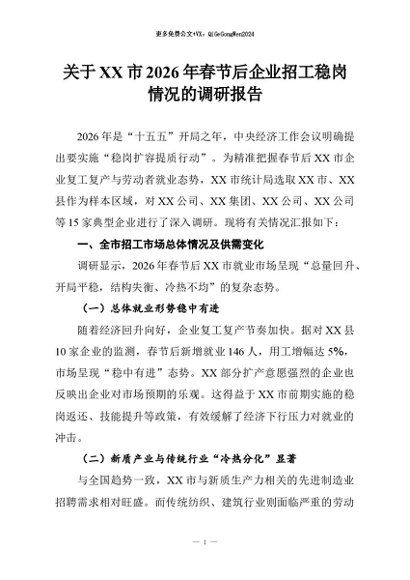 【七哥公文】2026年:关于XX市2026年春节后企业招工稳岗情况的调研报告+更多免费公文+VX:QiGeGongWen2024