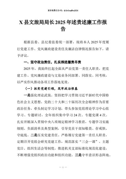 【七哥公文】2026年:X县文旅局局长2025年述责述廉工作报告+更多免费公文+VX:QiGeGongWen2024