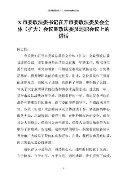 【七哥公文】2026年:X市委政法委书记在开市委政法委员会全体(扩大)会议暨政法委员述职会议上的讲话+更多免费公文+VX:QiGeGongWen2024