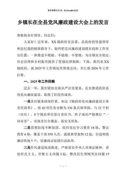 / 【七哥公文】2026年:乡镇长在全县党风廉政建设大会上的发言+更多免费公文+VX:QiGeGongWen2024