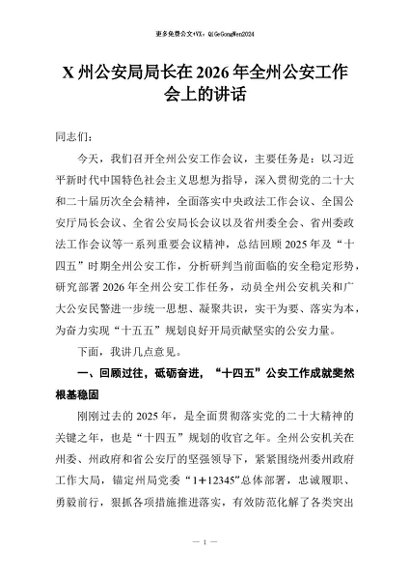 【七哥公文】2026年:X州公安局局长在2026年全州公安工作会上的讲话+更多免费公文+VX:QiGeGongWen2024