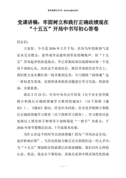 【七哥公文】2026年:党课讲稿:牢固树立和践行正确政绩观在“十五五”开局中书写初心答卷+更多免费公文+VX:QiGeGongWen2024