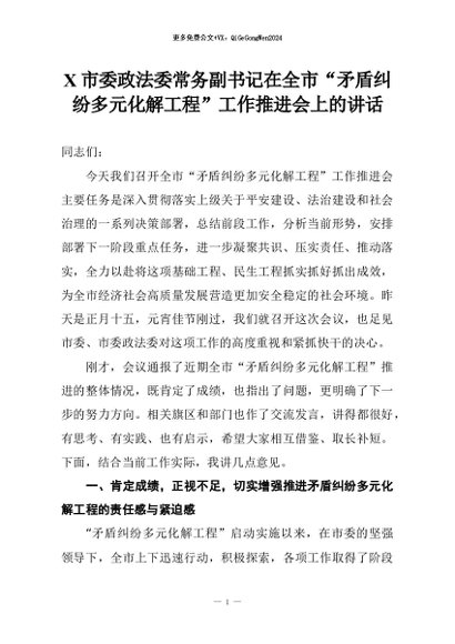 【七哥公文】2026年:X市委政法委常务副书记在全市“矛盾纠纷多元化解工程”工作推进会上的讲话+更多免费公文+VX:QiGeGongWen2024