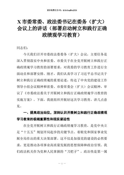 【七哥公文】2026年:X市委常委、政法委书记在委务(扩大)会议上的讲话(部署启动树立和践行正确政绩观学习教育)+更多免费公文+VX:QiGeGongWen2024
