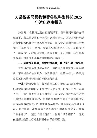 【七哥公文】2026年:X县税务局货物和劳务税科副科长2025年述职述廉报告+更多免费公文+VX:QiGeGongWen2024