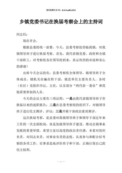 / 【七哥公文】2026年:乡镇党委书记在换届考察会上的主持词+更多免费公文+VX:QiGeGongWen2024