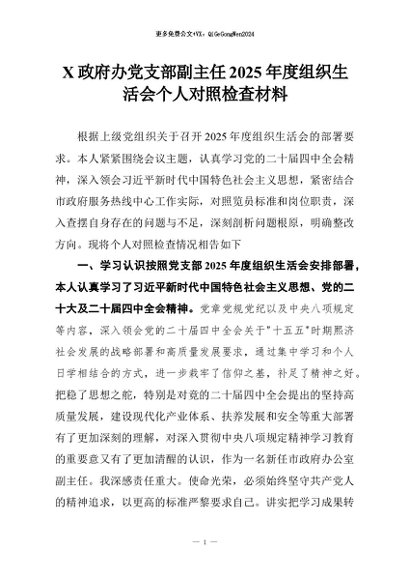 【七哥公文】2026年:X政府办党支部副主任2025年度组织生活会个人对照检查材料+更多免费公文+VX:QiGeGongWen2024