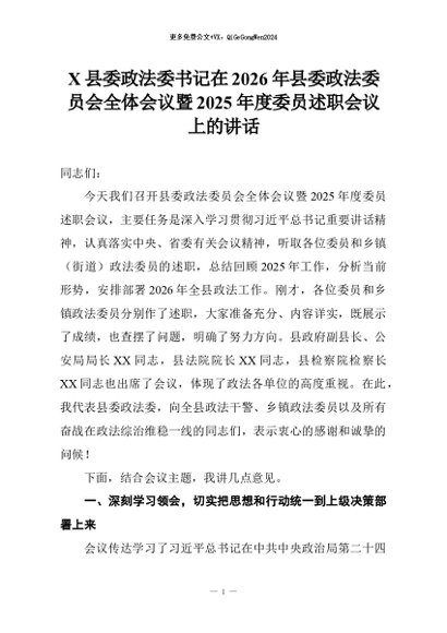 【七哥公文】2026年:X县委政法委书记在2026年县委政法委员会全体会议暨2025年度委员述职会议上的讲话+更多免费公文+VX:QiGeGongWen2024