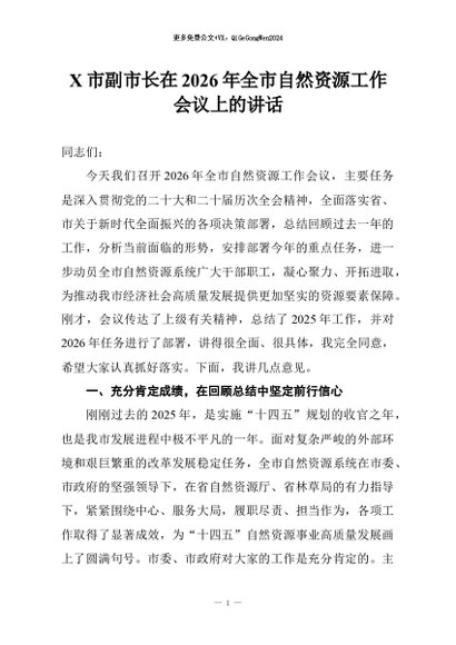 【七哥公文】2026年:X市副市长在2026年全市自然资源工作会议上的讲话+更多免费公文+VX:QiGeGongWen2024