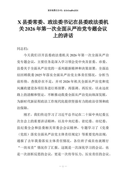 【七哥公文】2026年:X县委常委、政法委书记在县委政法委机关2026年第一次全面从严治党专题会议上的讲话+更多免费公文+VX:QiGeGongWen2024
