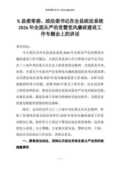 【七哥公文】2026年:X县委常委、政法委书记在全县政法系统2026年全面从严治党暨党风廉政建设工作专题会上的讲话+更多免费公文+VX:QiGeGongWen2024