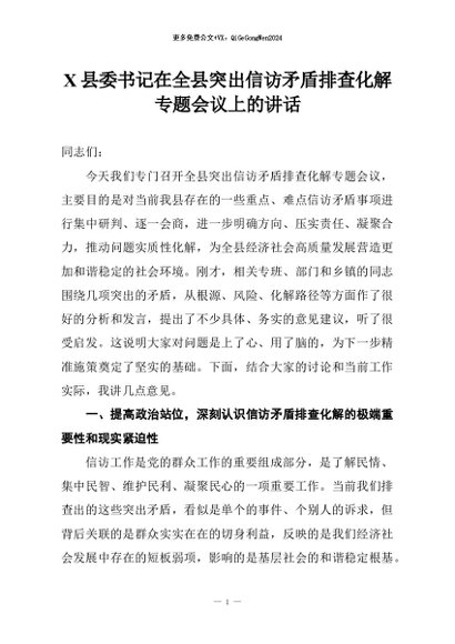 【七哥公文】2026年:X县委书记在全县突出信访矛盾排查化解专题会议上的讲话+更多免费公文+VX:QiGeGongWen2024