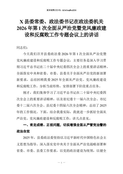 【七哥公文】2026年:X县委常委、政法委书记在政法委机关2026年第1次全面从严治党暨党风廉政建设和反腐败工作专题会议上的讲话+更多免费公文+VX:QiGeGongWen2024