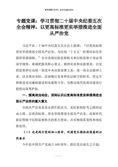 【七哥公文】2026年:专题党课:学习贯彻二十届中央纪委五次全会精神,以更高标准更实举措推进全面从严治党+更多免费公文+VX:QiGeGongWen2024