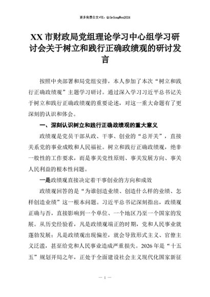 【七哥公文】2026年:XX市财政局党组理论学习中心组学习研讨会关于树立和践行正确政绩观的研讨发言+更多免费公文+VX:QiGeGongWen2024
