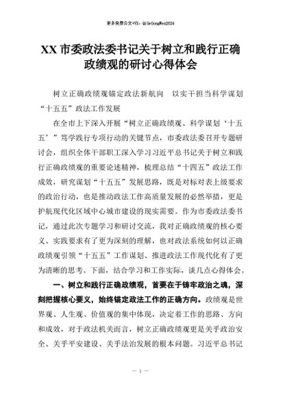 【七哥公文】2026年:XX市委政法委书记关于树立和践行正确政绩观的研讨心得体会+更多免费公文+VX:QiGeGongWen2024