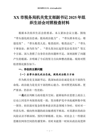 【七哥公文】2026年:XX市税务局机关党支部副书记2025年组织生活会对照检查材料+更多免费公文+VX:QiGeGongWen2024