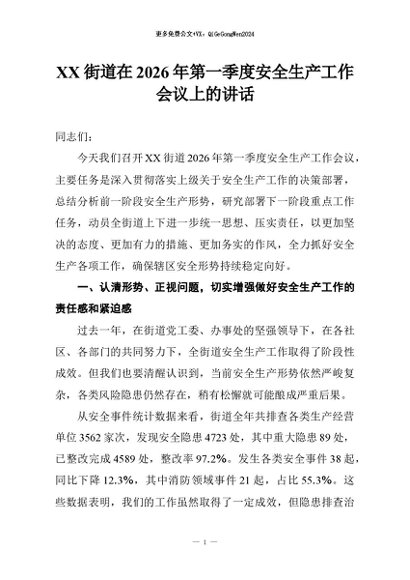 【七哥公文】2026年:XX街道在2026年第一季度安全生产工作会议上的讲话+更多免费公文+VX:QiGeGongWen2024