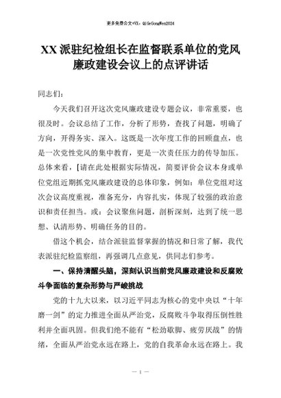 【七哥公文】2026年:XX派驻纪检组长在监督联系单位的党风廉政建设会议上的点评讲话+更多免费公文+VX:QiGeGongWen2024