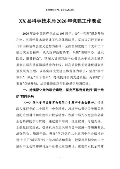 【七哥公文】2026年:XX县科学技术局2026年党建工作要点+更多免费公文+VX:QiGeGongWen2024