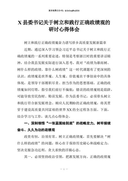 【七哥公文】2026年:X县委书记关于树立和践行正确政绩观的研讨心得体会+更多免费公文+VX:QiGeGongWen2024
