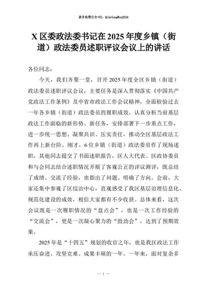 【七哥公文】2026年:X区委政法委书记在2025年度乡镇(街道)政法委员述职评议会议上的讲话+更多免费公文+VX:QiGeGongWen2024